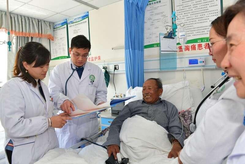 在西藏山南市人民医院,来自安徽的援藏医生梁有峰(左二)带领医生们查房。“组团式”医疗援藏提升了山南市医疗水平(2019年4月24日摄)。