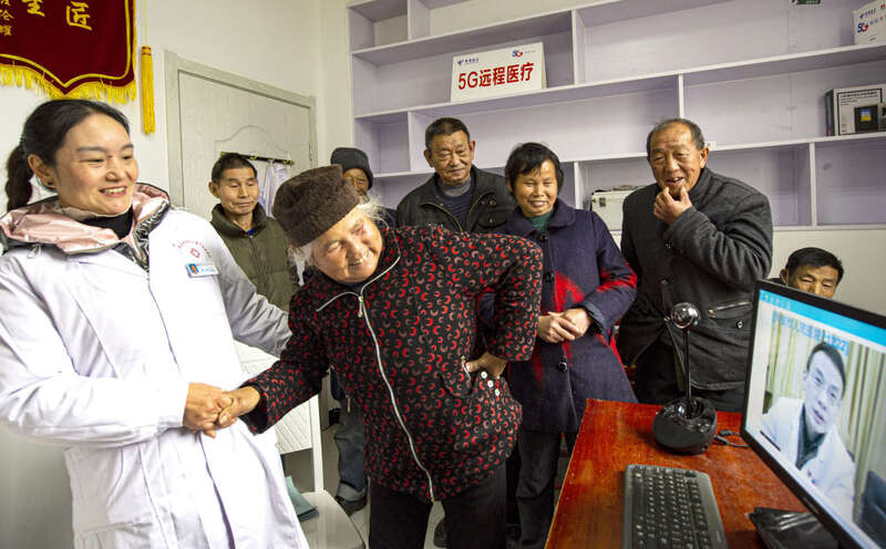 安徽金寨县大湾村村民方临芳(前右)指着自己身体疼痛的部位,在村医袁玲(前左)的帮助下向通过5G网络远程医疗会诊的专家讲述病情。“互联网+医疗”让村民在“家门口”也能享受专家诊疗(2020年12月3日摄)。