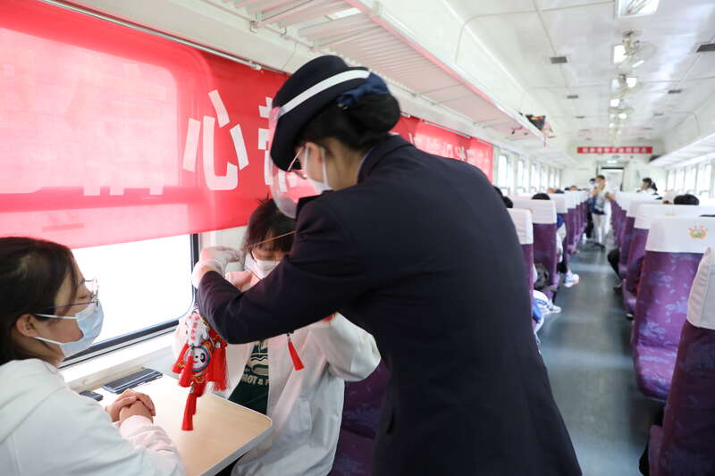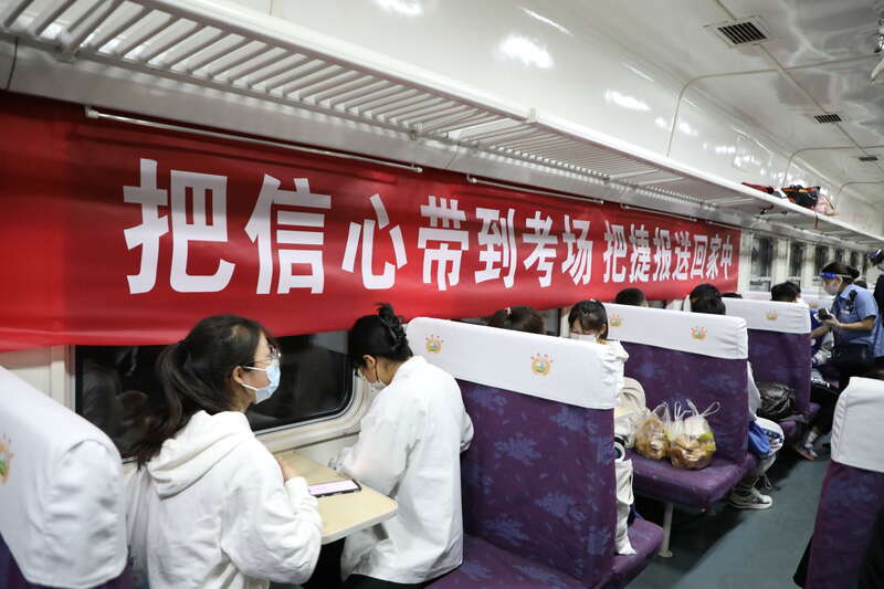 “祝各位参考学子金榜题名”“将信心带到考场 把捷报送回家中”……车厢里,挂满了各式的横幅,还有专门为考生准备的备考专座。考生们落座后,列车乘务员为每名学子送上“金榜题名”祝愿卡和寓意美好的祝福荷包,为大家鼓劲加油。