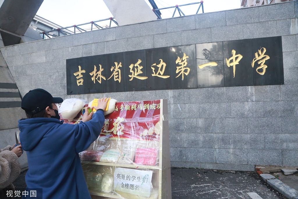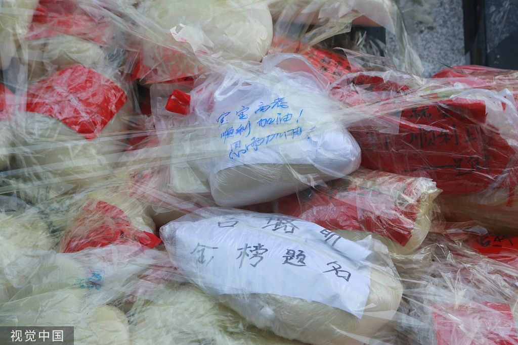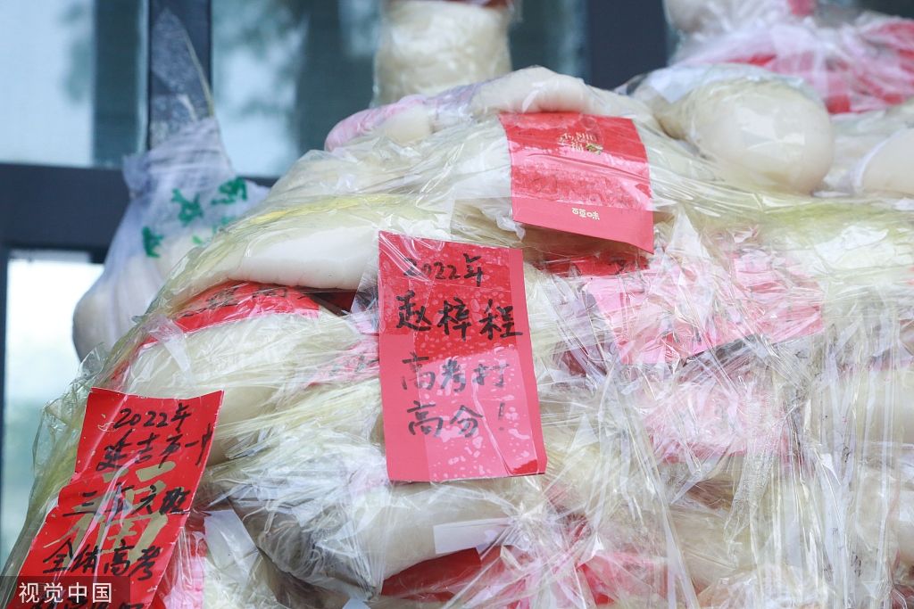 2022年6月7日凌晨4点,吉林延吉,延边二中考点门前的木板上已经贴满了打糕,不少家长还将写有孩子名字的纸条或是延吉至北京、上海等城市的车票,或是理想大学的校名夹在了打糕里,期待自己的孩子金榜题名。