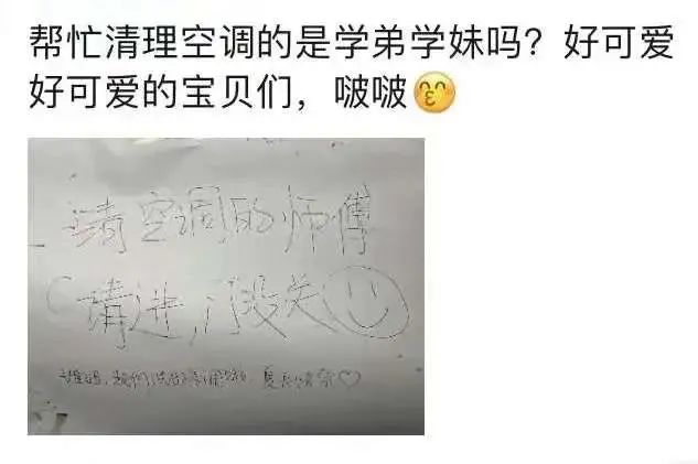 经管学院的范玮同学参与了空调清洗分队的志愿工作。她负责清洗一个宿舍的门上贴了“门没关,洗空调的师傅请进”。在清洗完空调之后,她上面回复在回了一句:“姐姐我们洗好啦,夏天快乐。”活动结束后,她在朋友圈里看到了姐姐们的回复。这让范玮十分感动:“今天才发现,抗疫志愿是有脉脉温情在其中的。进行志愿服务的人,心中的成就感和责任感要更加强烈。有了这样的经历,以后我也会怀着感恩去看待其他同学的志愿。”