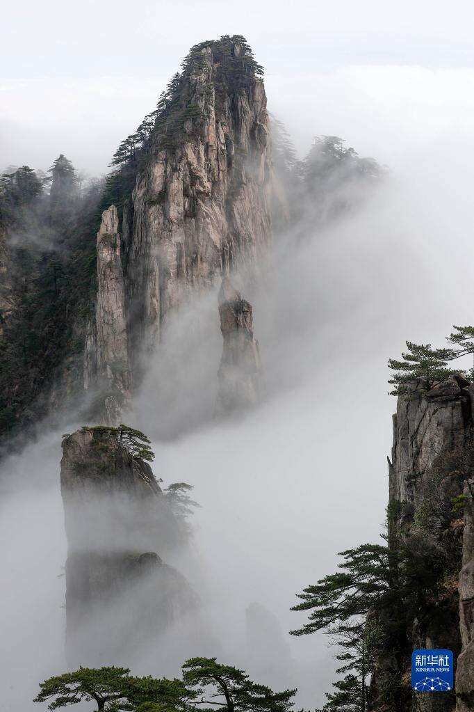黄山卧云峰的“瀑布流云”景观(2021年3月10日摄)。