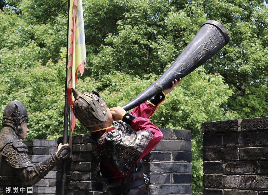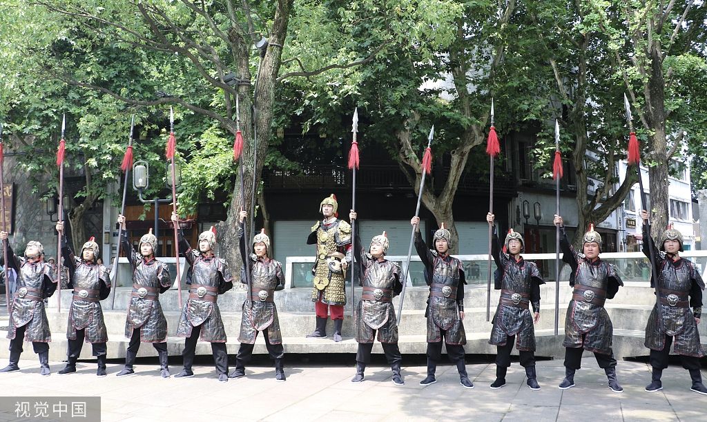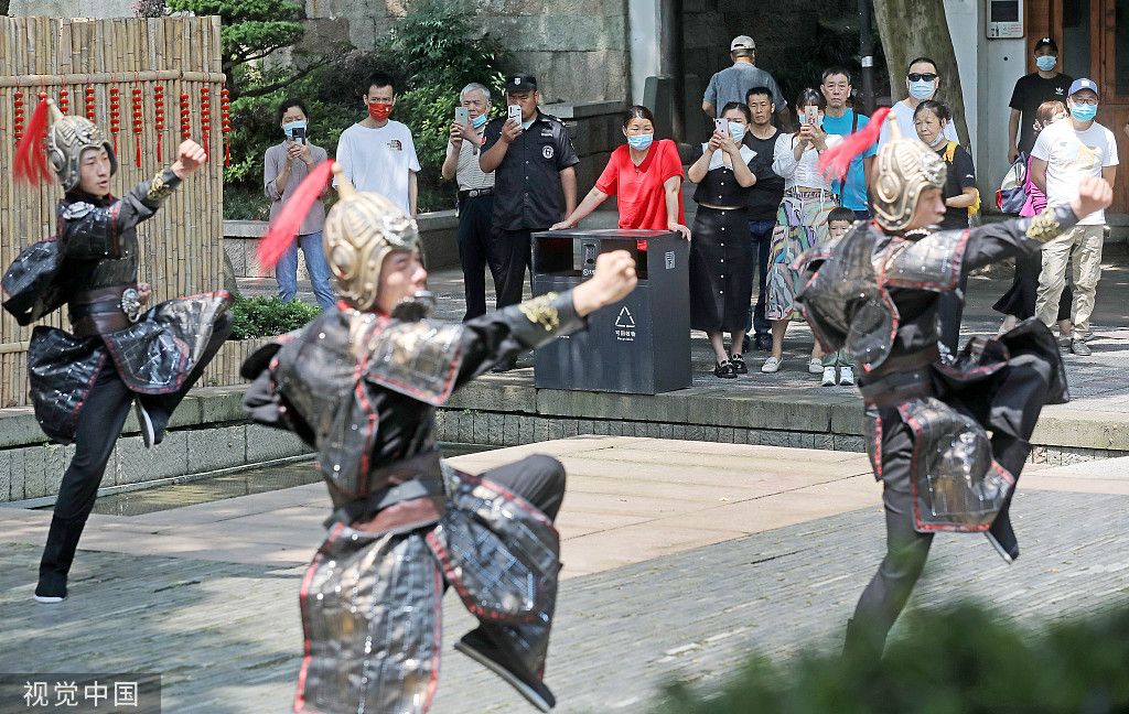 2022年6月7日,表演者通过实景演绎重现岳飞“精忠报国”故事。当日,2022“宋韵大秀场”在浙江杭州开演,通过剧情串联等沉浸式文化“快闪”的表现方式,展现宋韵文化魅力。 中新社记者 郭其钰 摄