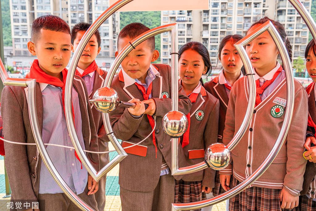 2022年6月7日,贵州毕节,孩子们在市实验学校里的操场上参观体验科技展项智力大闯关。