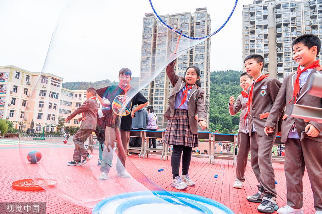 2022年6月7日,贵州毕节,孩子们在市实验学校里的操场上参观体验科技展项泡泡秀。