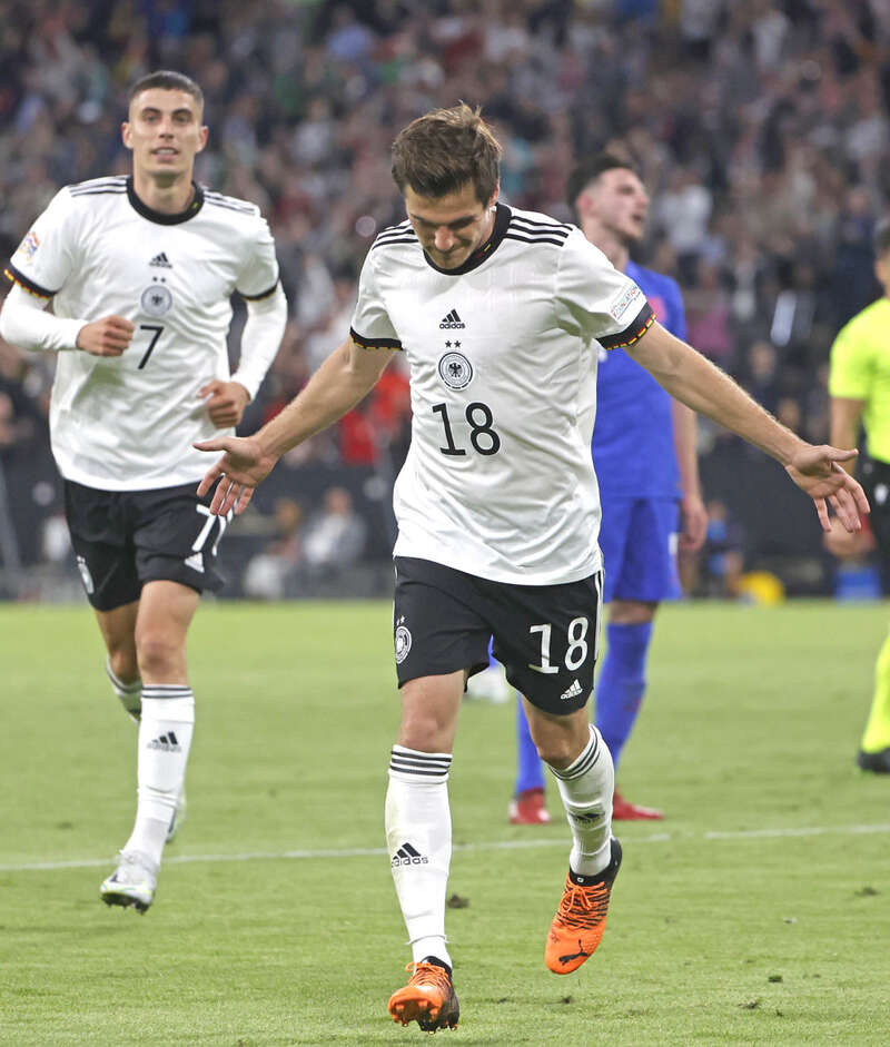 6月7日,德国队球员霍夫曼(前)在比赛中庆祝进球。新华社发(菲利普·鲁伊兹摄)