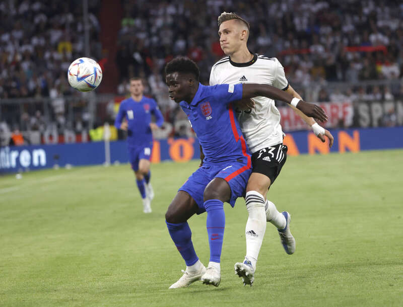 6月7日,德国队球员施洛特贝克(右)与英格兰队球员萨卡在比赛中拼抢。新华社发(菲利普·鲁伊兹摄)