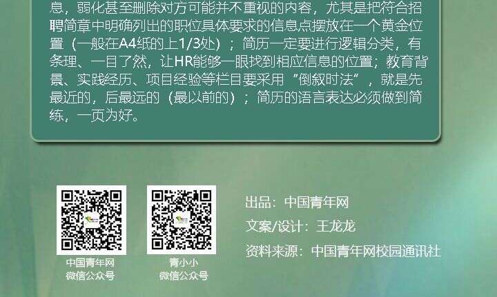 另外,王彦涛认为,简历还要注意内容简洁明了,“一页纸简历”即可;版面设计做到美观,前述“特质”突出体现。