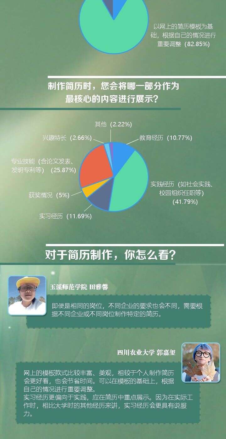 “每份工作都有它的特殊性,在简历制作时要体现出这一点。”四川农业大学草业科学专业学生郭嘉玺表示,自己在制作简历时会针对于每个企业的不同侧重,制作特定简历,体现个人优势和特长。