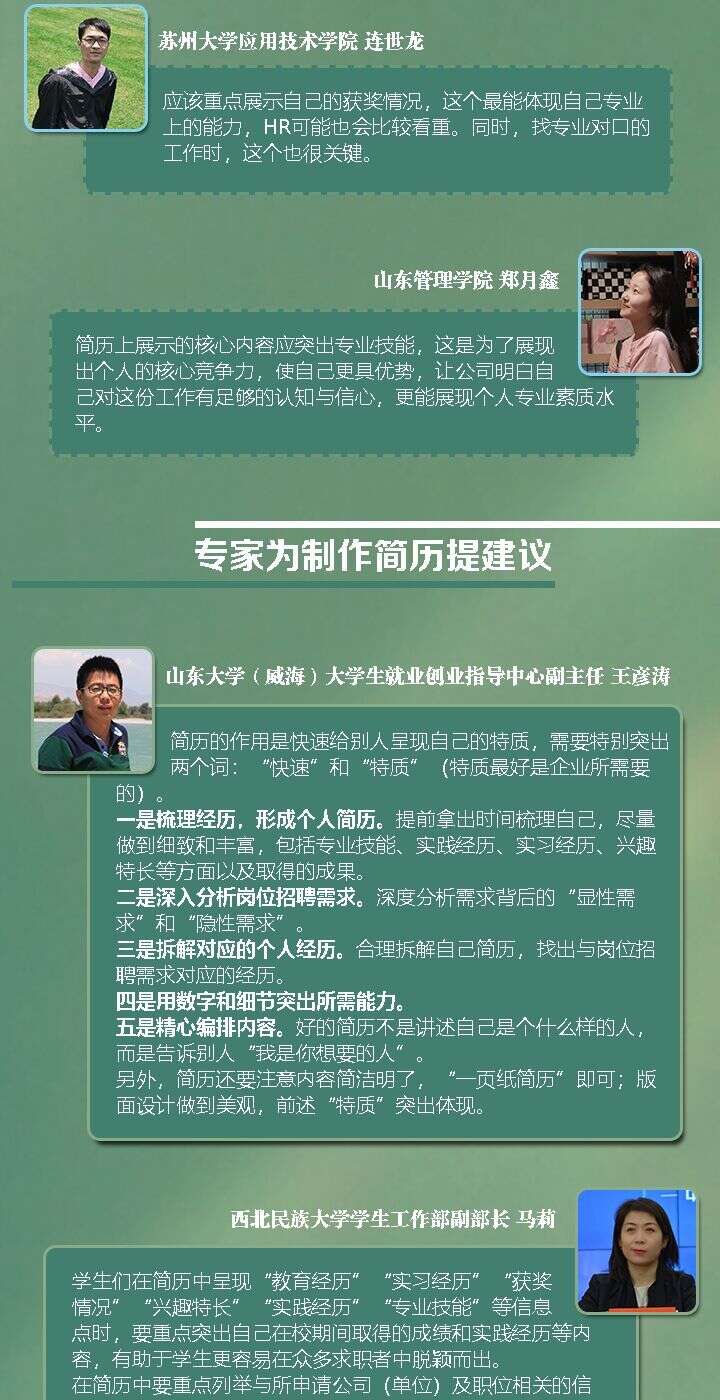 看到本次调研结果,西北民族大学学生工作部副部长马莉表示,针对不同工作制定特定的简历,是十分正确的做法。首先反映了学生的求职态度很端正,简历必须要有针对性,在求职时简历的“客户化”“精准化”,会让HR在众多简历中看到求职学生的用心;其次反映了求职学生的综合素养,不是盲目投递简历,而是有备而来,诚意满满。