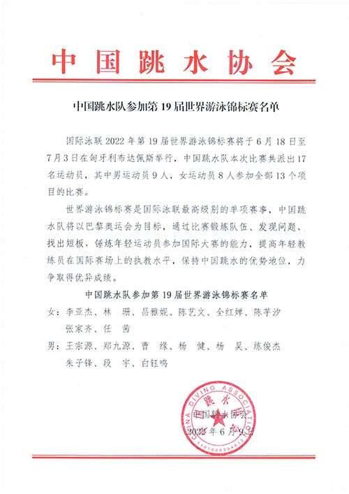 中新网客户端北京6月9日电 9日上午,中国游泳协会官网公布中国跳水队参加2022年布达佩斯游泳世锦赛的参赛名单。中国跳水队本次共派出17名运动员参赛,奥运冠军全红婵、曹缘领衔。