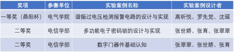 电信学部张世娇等人的作品“多功能电子密码锁的设计与实现”和张翠翠等人的作品“数字门器件基础认知”获得二等奖。