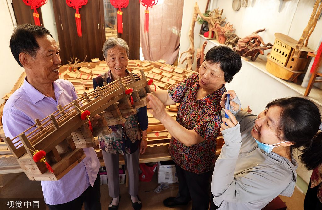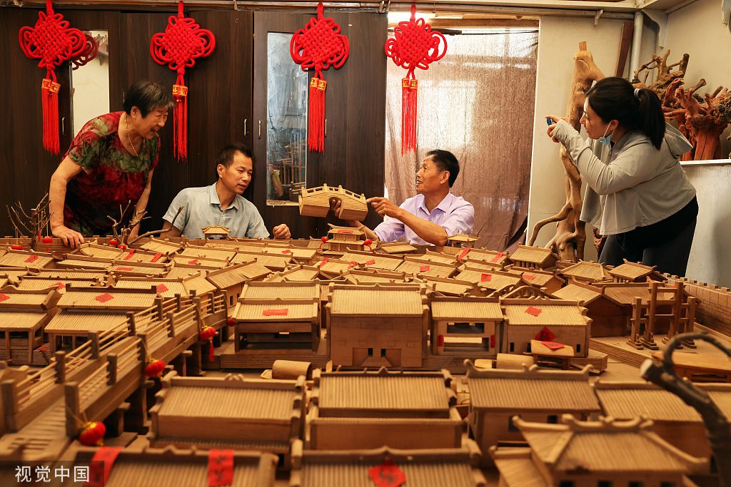 2022年6月8日,浙江省湖州市德清县乾元镇直街社区,谈楚堃(左一)手捧长桥模型讲解老县城故事,年轻居民情不自禁拍照留念。