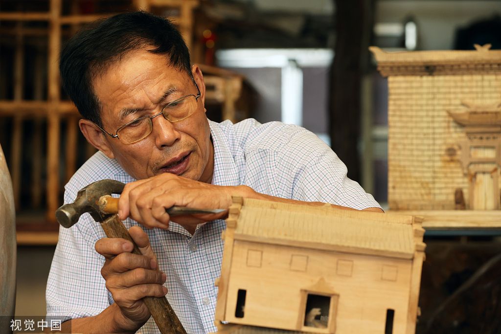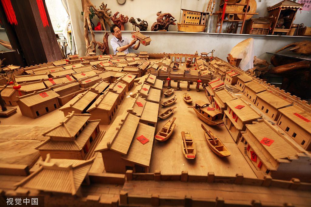 2022年6月8日,浙江省湖州市德清县乾元镇直街社区,谈楚堃在查看老县城模型是否完美。