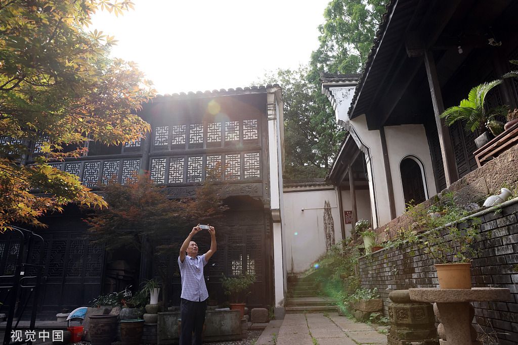 2022年6月8日,浙江省湖州市德清县乾元镇吕祖庙,谈楚堃用智能手机记录古建筑。