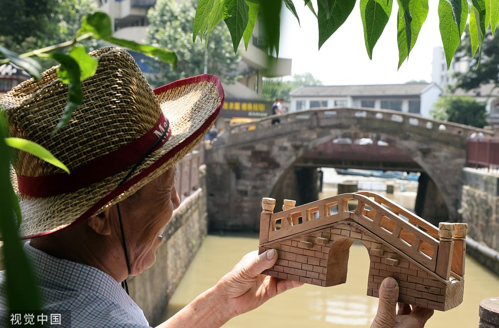 2022年6月7日,浙江省湖州市德清县乾元镇,谈楚堃拿着孩儿桥模型,在浙江省文物保护单位——孩儿桥前面做对比。