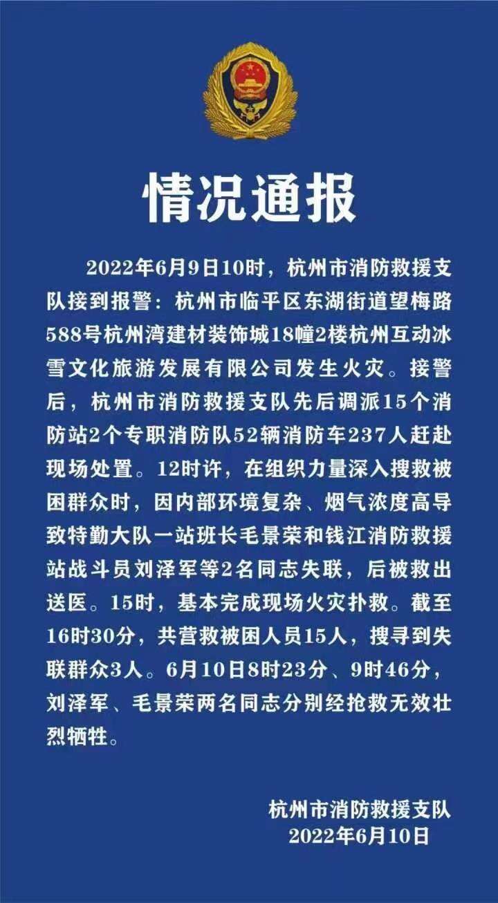 据杭州消防消息,2022年6月9日10时,杭州市消防救援支队接到报警:杭州市临平区东湖街道望梅路588号杭州湾建材装饰城18幢2楼杭州互动冰雪文化旅游发展有限公司发生火灾。接警后,杭州市消防救援支队先后调派15个消防站2个专职消防队52辆消防车237人赶赴现场处置。12时许,在组织力量深入搜救被困群众时,因内部环境复杂、烟气浓度高导致特勤大队一站班长毛景荣和钱江消防救援站战斗员刘泽军等2名同志失联,后被救出送医。15时,基本完成现场火灾扑救。截至16时30分,共营救被困人员15人,搜寻到失联群众3人。6月10日8时23分、9时46分,刘泽军、毛景荣两名同志分别经抢救无效壮烈牺牲。