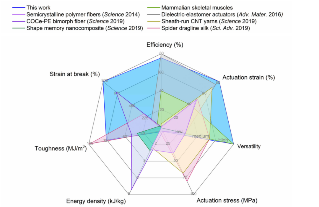 高取向性的晶体结构在原有的水凝胶网络基础上,不但极大地增强了纤维的机械性能,同时赋予了人工肌肉优异的致动性能。例如,自组装人工肌肉可以在承载700倍自重的条件下,实现150%/s的高速致动。与近年来报道的其他人工肌肉相比,自组装人工肌肉在多个方面展示出了优异的表现(图2)。