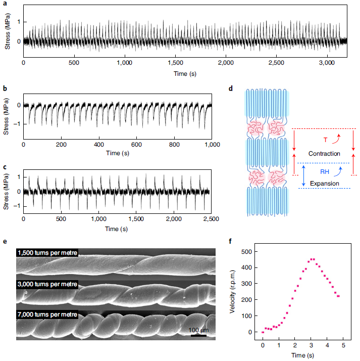 自组装人工肌肉具有良好的循环性和多重响应性。例如,变温可以驱动纤维可逆收缩(图 3a),而改变湿度则可以通过材料吸附实现纤维的可逆膨胀(图 3b)。当两种刺激同时使用,纤维可以根据需要产生收缩或扩张应力(图 3c,3d)。除了线性致动,研究团队还制备了螺旋型的转动致动器,可用于开发微型马达(图3e,3f)。该研究不但展示了一类可回收的高性能人工肌肉的制备,同时有望为开发具有多功能及不同性质的软体致动器提供新的灵感。
