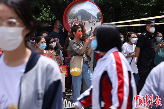 家长和送考老师们穿着印有“高考加油”“金榜题名”等字样的文化衫,或是红色系的旗袍、长裙,为考生“应援”。他们关切的目光隐藏在手机屏幕后,时刻聚焦在走入或走出考场的学生们身上。