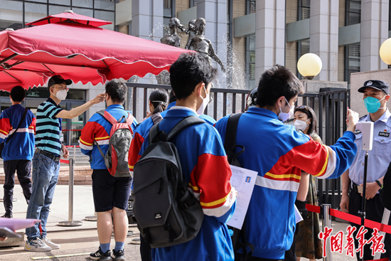 据教育部统计,今年全国有1193万考生报名参考,比去年增加115万人。今年4月底以来,北京多地疫情反弹,为高考防疫工作增加了挑战。6月7日,中青报·中青网记者在北京高考考点看到,疫情下,考生进入考场前需出示健康码、行程码,测量体温并登记信息。