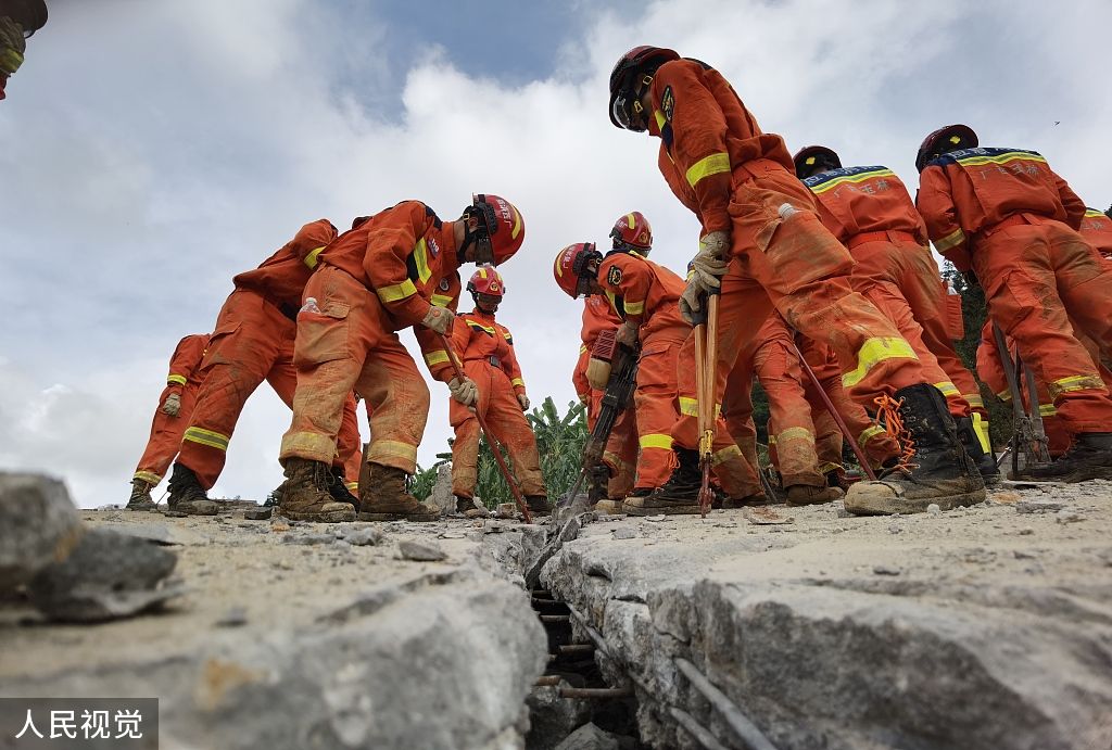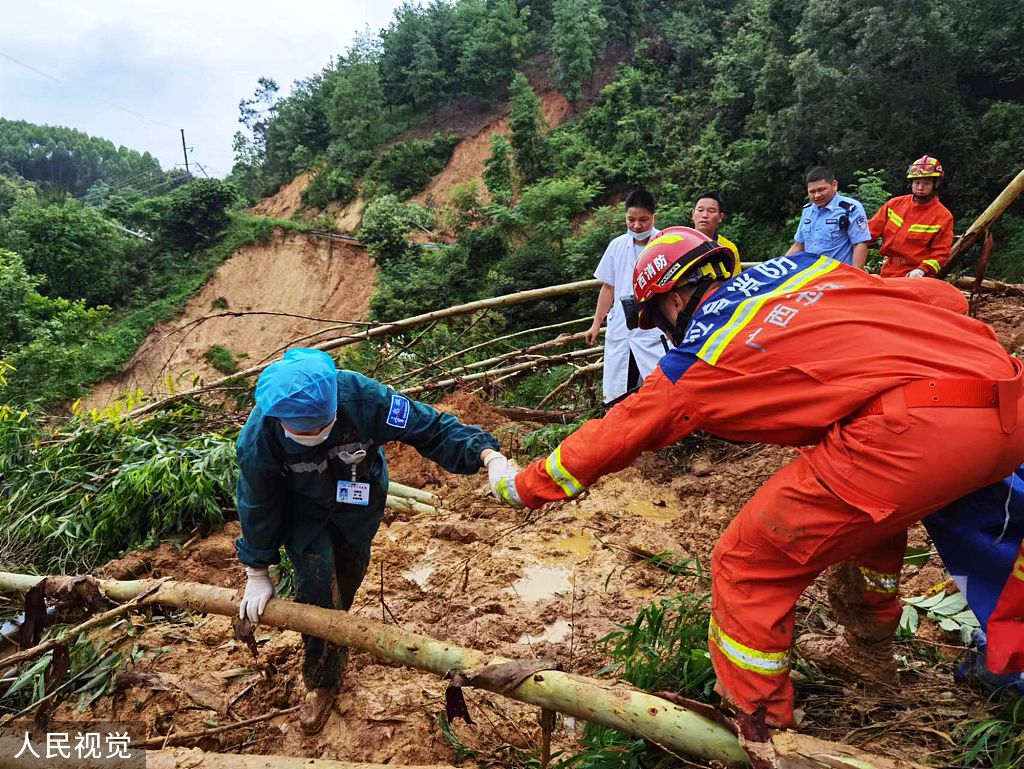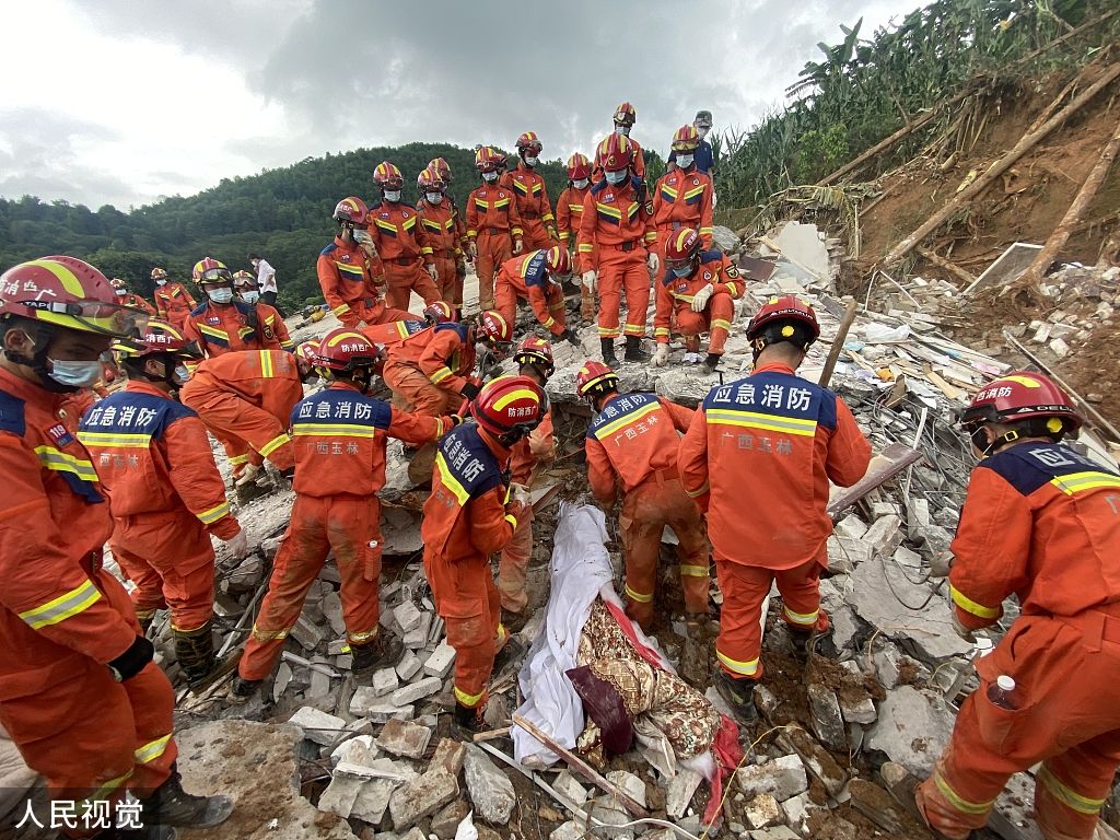 2022年6月9日,在广西北流市新丰镇大村,玉林市消防救援支队在房屋倒塌现场开展救援。