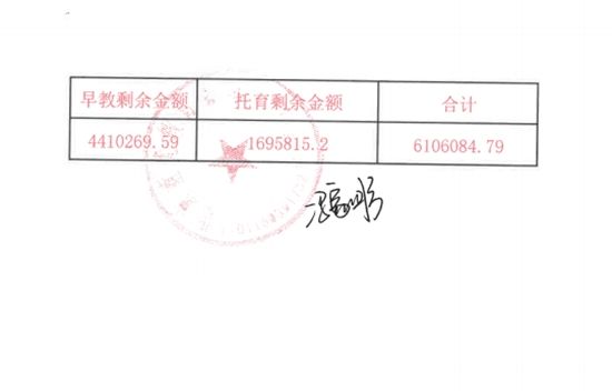 由北京童优教育咨询有限公司盖章、法定代表人冯家彤签字的两份费用明细表显示,家长们预交学费后目前尚剩余(未上课)的金额,共计6106084.79元,其中托育169万多元,早教441万余元,一共涉及已缴学费的503个孩子。