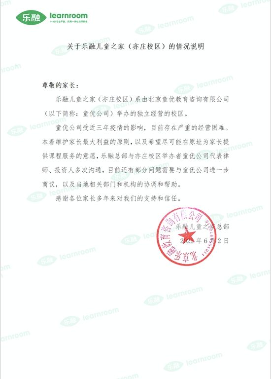 “乐融儿童之家”亦庄校区停止经营后,6月4日,北京乐融教育咨询有限公司向家长发出《关于乐融儿童之家(亦庄校区)的情况说明》。该“情况说明”称,乐融儿童之家亦庄校区是由北京童优教育咨询有限公司举办的“独立经营的校区”,目前乐融儿童之家总部正与亦庄校区投资方进行沟通协商。