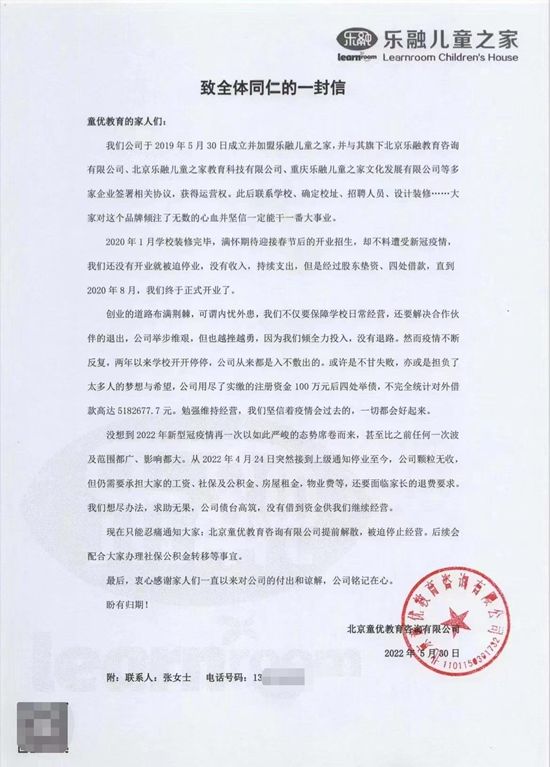 这封信加盖了“北京童优教育咨询有限公司”的印章。信中称是受疫情等因素的影响,公司债台高筑,没有资金继续经营,“现在只能忍痛通知大家:北京童优教育咨询有限公司提前解散,被迫停止经营。”