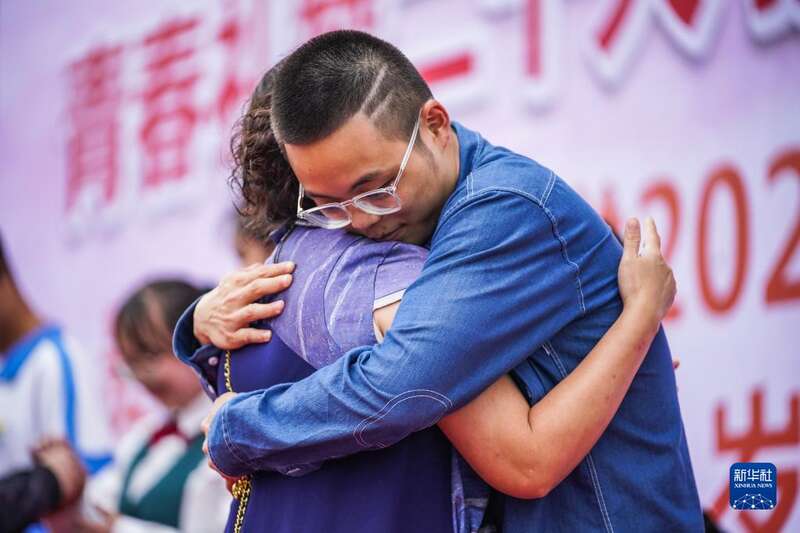 6月9日,贵阳市乌当中学高三学生在毕业典礼上拥抱母亲。