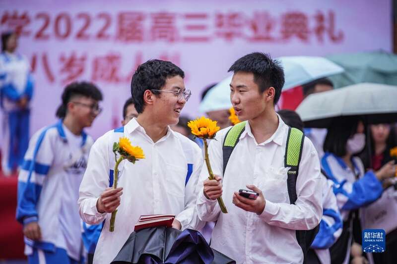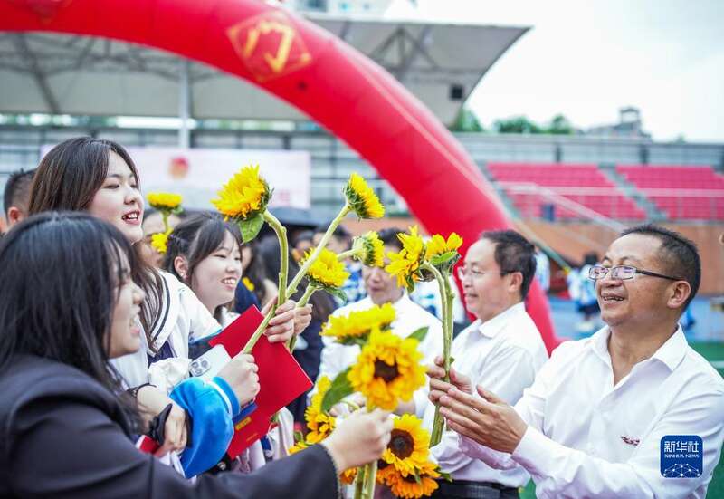 6月9日,贵阳市乌当中学高三学生接过老师赠送的向日葵。