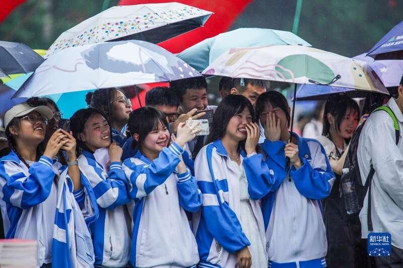 6月9日,贵阳市乌当中学高三学生在雨中阅读父母写给他的信。
