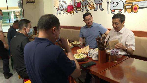 在四楼餐饮区,王效光走进一家特色小吃店,见店内餐桌、凳椅、消毒碗筷等摆放得井然有序,正在消费的市民也按照防疫要求有序用餐,点了凉皮等食用。用餐过程中,王效光还询问了餐饮企业经营情况。
