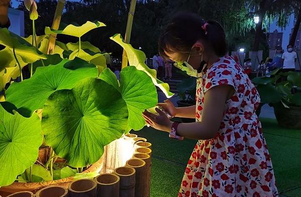 2022年6月10日晚7时,夜幕降临,燥热散去,2022年武汉荷花节主展区沙湖公园里灯光亮起,一场简单又独特的启幕仪式惊艳亮相。启幕仪式前,沙湖公园的600余种近5000盆荷花浸入夜色。众多市民就着灯光,寻找着最佳拍荷角度。晚上7时整,启幕式自然音乐会开始。在凉爽湖风和阵阵花香中,艺术家团队有的坐在古筝前,有的抱着大提琴、吉他,他们或合奏或独奏,《荷塘月色》《水之影》《莲》等一首首经典曲目接连不断地流淌出来。台下摆着竹床阵,观众们随意就座,仿佛饭后的一场轻松的朋友小聚。当晚,荷塘主题3D荷花地画引人注目,荷花光影互动人气最旺。据了解,本届荷花节共展出各类荷花600余种,有市集、花艺、音乐会、科普等各色活动近30场,在沙湖公园、月湖公园等9个举办地轮番上演。服务经济民生、突出“夜游”特色、加强趣味互动、融合多方资源、紧贴“湿地花城”名片,是2022年武汉荷花节的主要亮点。