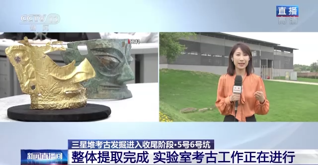 总台央视记者 任梅梅:5号坑和6号坑都已经完成了整体提取工作。“金光闪闪”的5号坑,曾经发现了大量金器,比如金面具、鸟形金饰片、有孔的圆形金箔片、斧形金器、小金珠等。考虑到5号坑里的器物非常细碎,考古队员对5号坑进行整体打包,目前已经整体提取到文保中心,正在开展实验室考古。