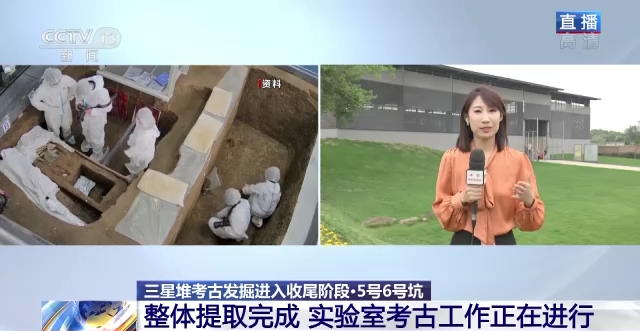 总台央视记者 任梅梅:我身后就是三星堆遗址考古发掘大棚,目前6个新发现的祭祀坑考古发掘工作总体已经开始进入收尾阶段,其中3号坑和4号坑已经完成现场的发掘工作,5号坑和6号坑整体提取进入实验室发掘阶段。