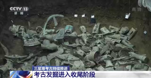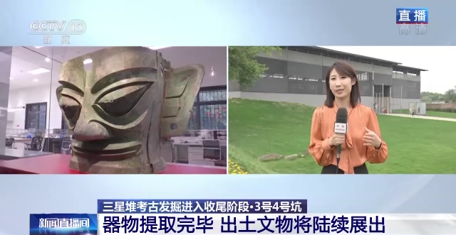 总台央视记者 任梅梅:3号坑和4号坑发掘进度最快,文物已经全部提取,目前是处于“封坑”的状态。3号坑曾经出土了不少“明星文物”,比如在春晚亮相的青铜大面具,这也是目前三星堆出土的体量最大、相对最完整的青铜大面具。