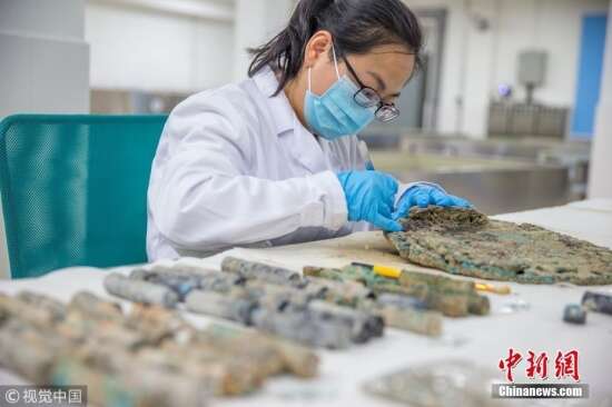 广东省博物馆文物保护科技中心出水文物保护实验室里,宋薇正在清理一块南澳一号出水的铜料,由于长期浸泡在水里,文物留有海洋生物,一块牡蛎壳仍留在铜料上。谭庆驹 摄 图片来源:视觉中国