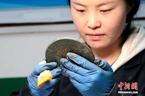 在陕西省咸阳市大堡子村,陕西省考古研究院考古人员发现一处西汉时期大型墓地,出土了80多件汉代铜镜。这批铜镜中有的保存良好、纹饰清晰,经清理修复后仍光可鉴人。张远 摄