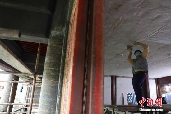 飞龙阁位于沈阳故宫中路外朝区域东侧,建于乾隆十一年至十三年,硬山式砖木二层楼阁建筑。飞龙阁内檐为新中国成立后重做的顶棚,二层顶棚裱糊纸张在维修前已全部脱落缺失。图为工作人员对飞龙阁内檐顶棚裱糊进行复原修复工作。 于海洋 摄