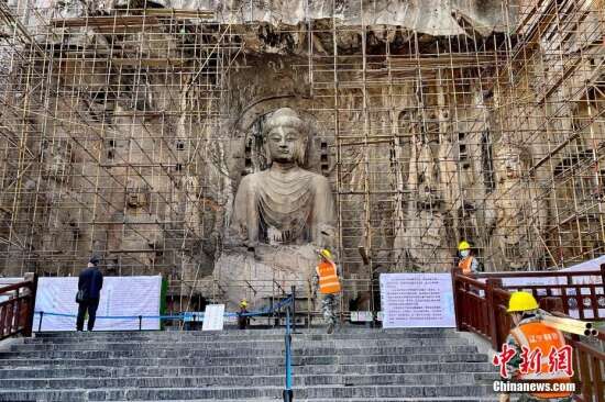 龙门石窟奉先寺大规模修复工程正有序推进。此次修复以渗漏水治理、危岩体加固为主,施工采取半开放方式,期间观众仍可看到卢舍那大佛的容颜。图为施工人员将材料搬运至龙门石窟景区。 张亚光 摄