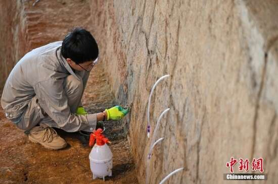 杭州良渚古城遗址南城墙遗址点,专业技术人员正小心翼翼地对南城墙剖面遗迹上的裂痕进行修复。良渚古城遗址是土遗址,易受到潮湿环境影响,出现渗水、干裂、表面粉化脱落、失色、生物病害等问题。据介绍,这是良渚古城遗址南城墙剖面展示后,首次对遗址本体进行系统性保护修复工作。修复完成后,遗址本体的面貌将最大程度恢复到遗址出土时的状态。图片来源:视觉中国