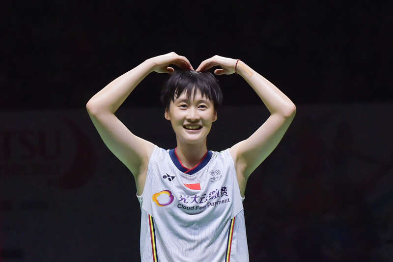↑陈雨菲在赛后“比心”庆祝。