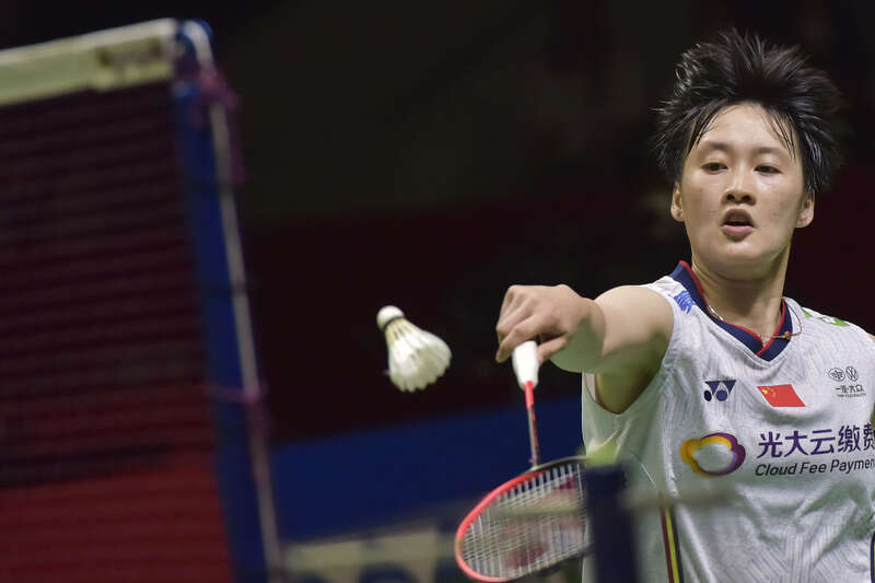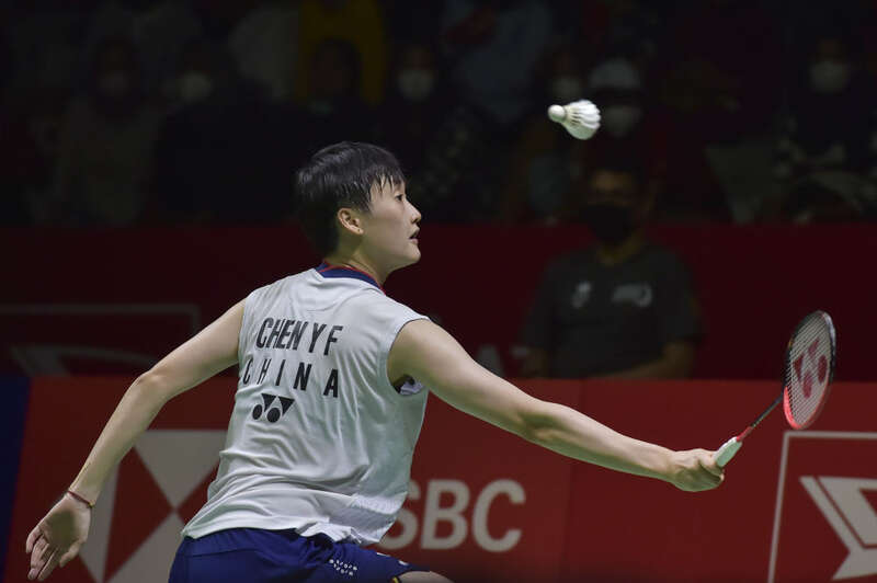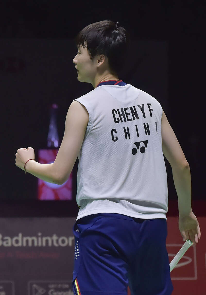 ↑陈雨菲在比赛中回球。