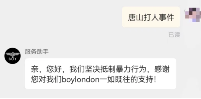 目前,品牌方已将#唐山打人事件#等关键词设置成自动回复,称“坚决抵制暴力行为。”