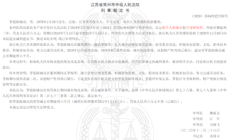 2019年2月,泰州医药高新技术产业开发区人民法院作出判决,认定被告人陈晓亮犯开设赌场罪,判处有期徒刑三年并处罚金六万元。刑期自2018年7月起至2021年7月。