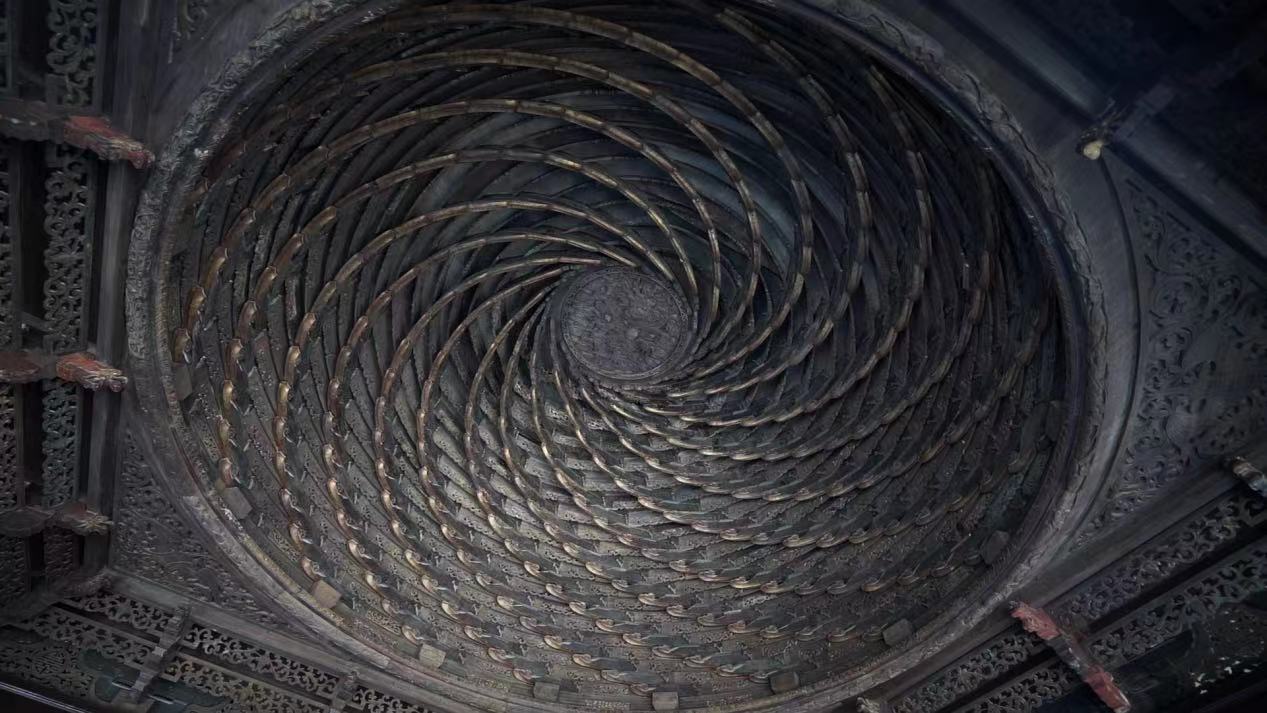 天后宫戏台螺旋形藻井是建筑中最出彩的部位之一,由700多个构件组成。建为历保的古建筑木作非物质文化遗产传承人和“香山匠人”利用他们丰富的经验,结合三维模拟等技术手段,摸清了藻井各个部件之间的逻辑关系,最后准确还原了藻井的模样。