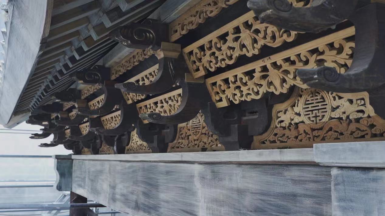 天后宫斗拱、花版、拱垫板等木构件安装后