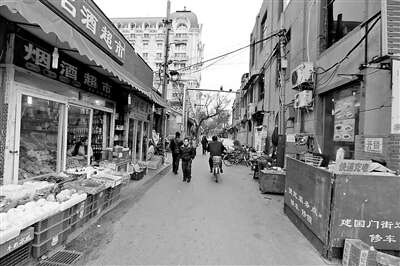 好不容易来到这里,却到其门而不能入,这让我心有不甘,于是转到了这处建筑的西侧。西侧有一个生了锈的大铁门,铁门的西侧却是一处小区。我走进小区,希望能找到突破口。从小区的南侧穿入,一直走到了北门也无法望见东侧的情形。北边的大铁门上着锁,望了望旁边的收发室,里面没有人影,于是我大胆拨开铁门,穿到了另一条胡同内。远远望去,胡同的中段有一座高大的仿古建筑,我怀疑那是同文馆的后门,于是沿此前行,走到了此处大门口。