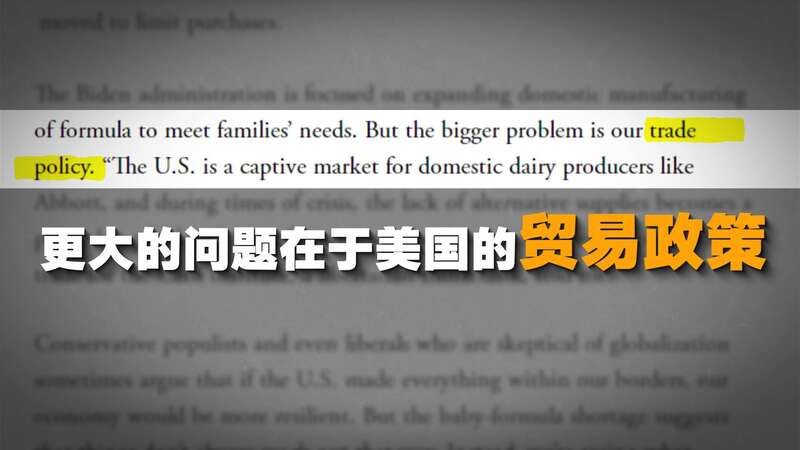 为保护国内生产商免受外国产品的竞争冲击,美国严格控制配方奶粉进口,高筑关税壁垒。在疫情等外部因素的冲击下,美国大搞贸易保护主义等累积已久的问题终于以一场奶粉危机的形式暴露出来……